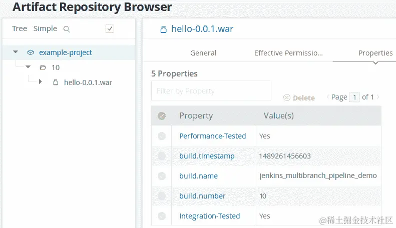 - 展开仓库,您应该看到构建的构件和属性,如下截图所示: