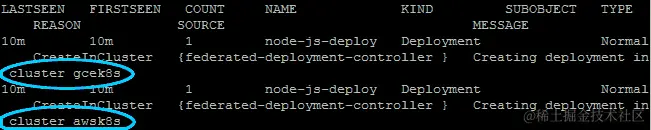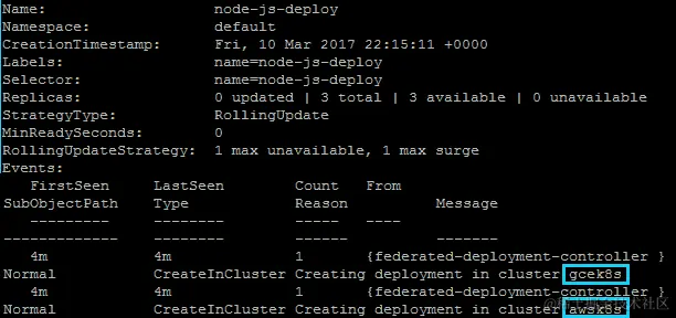 我们应该看到类似以下的内容。请注意,Events: 部分显示了我们在 GCE 和 AWS 上的部署情况: