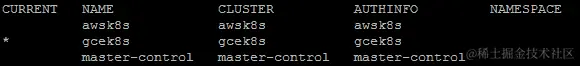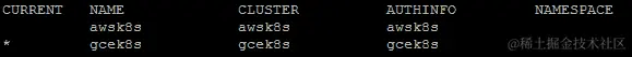 如果我们现在看一下我们的上下文,我们会注意到我们刚刚创建的awsk8s和gcek8s。gcek8s前面的星号表示它是kubectl当前指向并执行的位置: