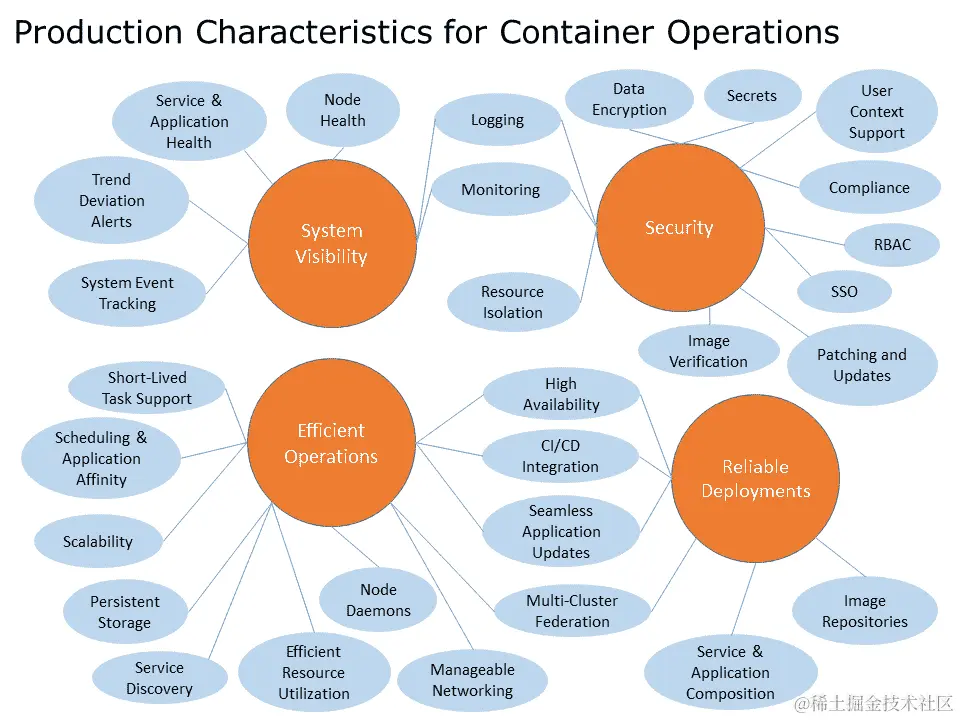 有许多特性定义了一个容器生产就绪系统。以下图表提供了一个高级视图,涵盖了生产就绪集群的主要关注点。这绝不是一个详尽的列表,但旨在为投入生产操作提供一些坚实的基础: