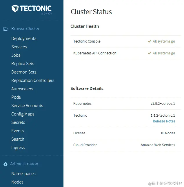 类似于 Red Hat,CoreOS 还提供了类似的支持套餐,为构建在其上的开源软件 Tectonic 提供 24x7 支持。Tectonic 还提供定期的集群更新以及一个漂亮的仪表板,显示了 Kubernetes 的所有组件的视图。CoreUpdate 允许用户更多地控制自动更新。此外,它还提供了用于监控、SSO 和其他安全功能的模块。