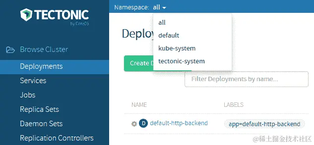 浏览仪表板系统中任何位置的一个有用功能是命名空间:过滤选项。只需点击显示资源的任何页面顶部旁边的下拉菜单旁边的“Namespace:”,我们就可以按命名空间筛选我们的视图。如果我们想要过滤掉 Kubernetes 系统 pod 或只查看特定的一组资源,这可能会有所帮助: