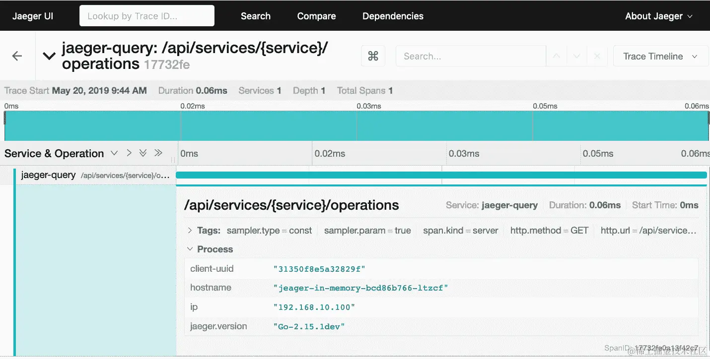 Jaeger 有一个非常漂亮的 Web UI,可以让您深入了解和探索分布式工作流程。