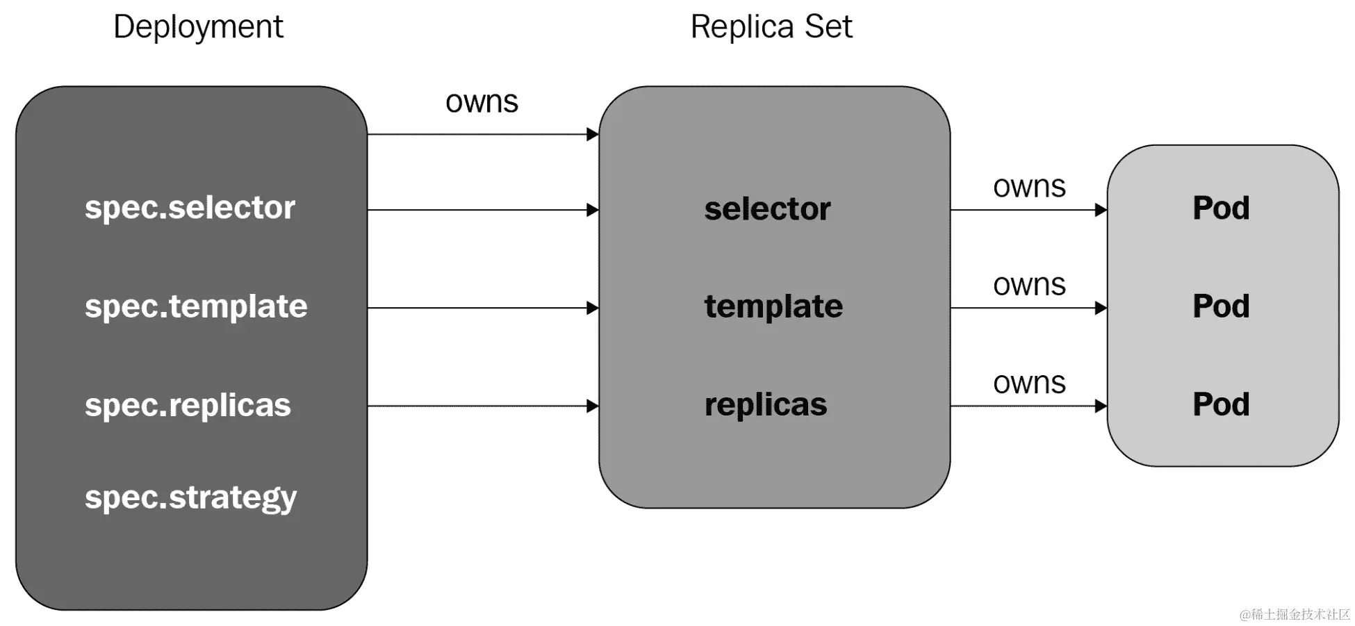 部署是通过 ReplicaSet 管理 pod 的 Kubernetes 资源。Kubernetes ReplicaSet 是一组由一组共同的标签标识并具有一定数量副本的 pod。ReplicaSet 与其 pod 之间的连接是 pod 元数据中的 ownerReferences 字段。ReplicaSet 控制器确保始终运行正确数量的副本。如果某个 pod 因任何原因死亡,ReplicaSet 控制器将安排一个新的 pod 来替代它。以下图示了这种关系: