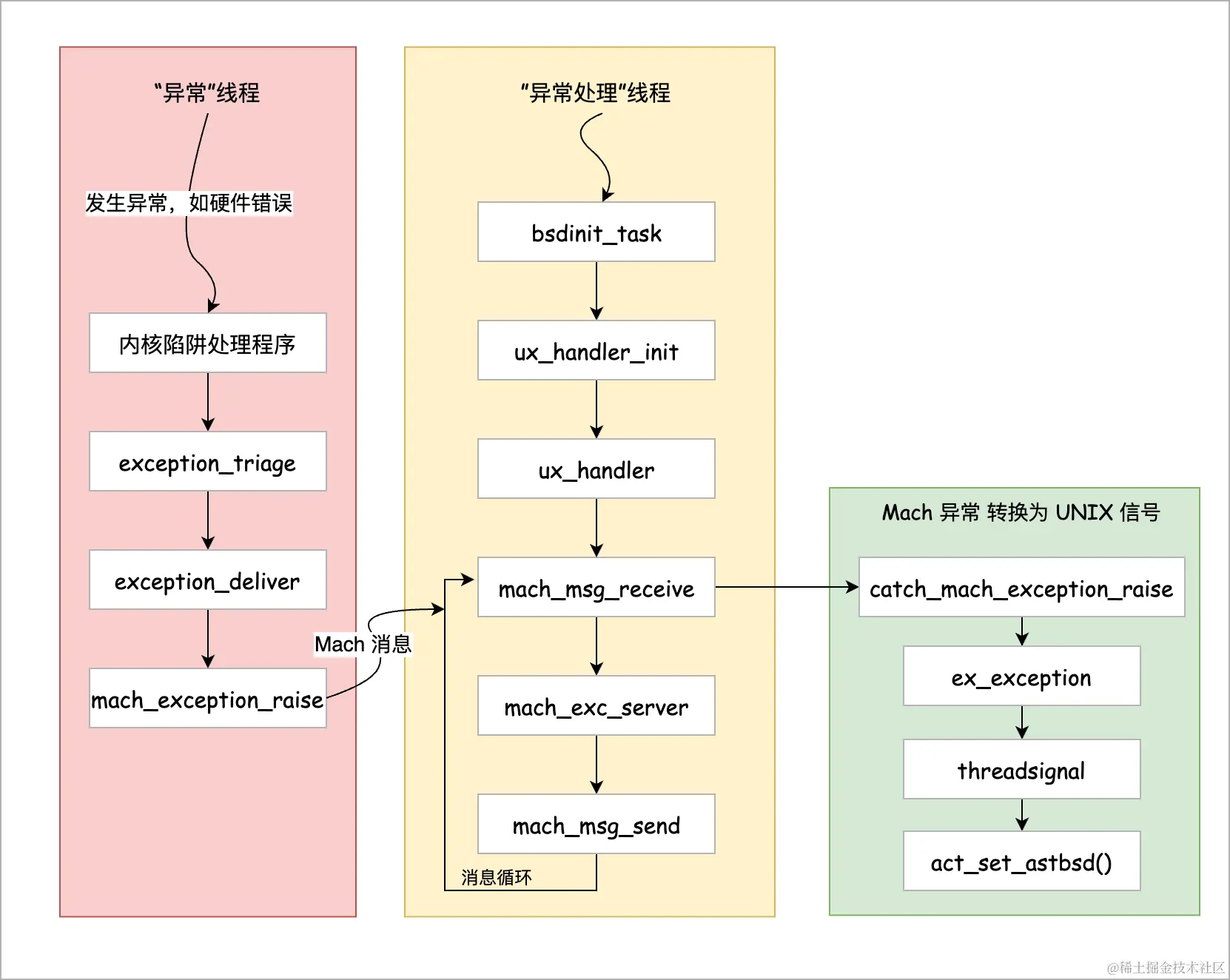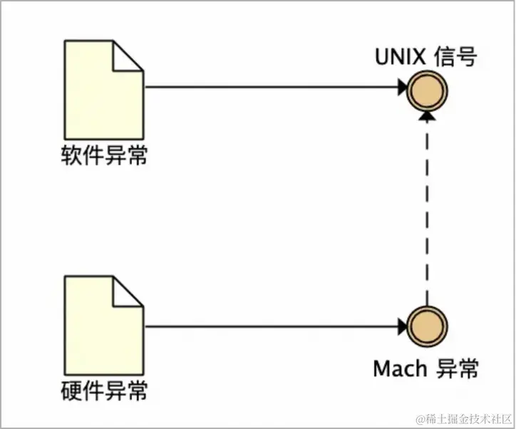 整个异常机制是建立在 Mach 异常之上的,所有软件/硬件异常都会先转换成 Mach 异常,进而转为UNIX信号。