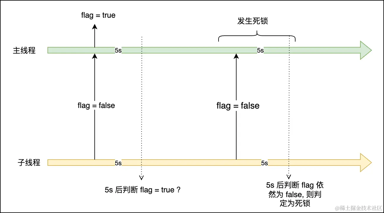 - 回到主线程中更改一个变量的值,5s(时间长短可自设)后判断该变量的值是否发生改变。若没有发生改变,则判定主线程发生死锁。否则继续循环该流程。