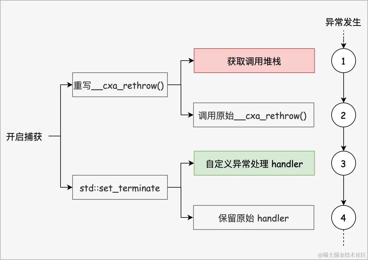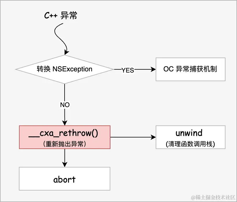 2、如果此C++异常不能转换为OC异常,则使用_cxa_rethrow()再次抛出
