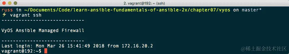 正如在本章开头已经提到的,我们将使用 Vagrant 启动一个网络设备,然后运行一个 playbook 来应用基本配置。我们将要启动的设备是 VyOS。虽然设备将是完整的 VyOS 安装,但我们将只应用一个测试配置,以便让您了解我们在上一节提到的模块如何使用。