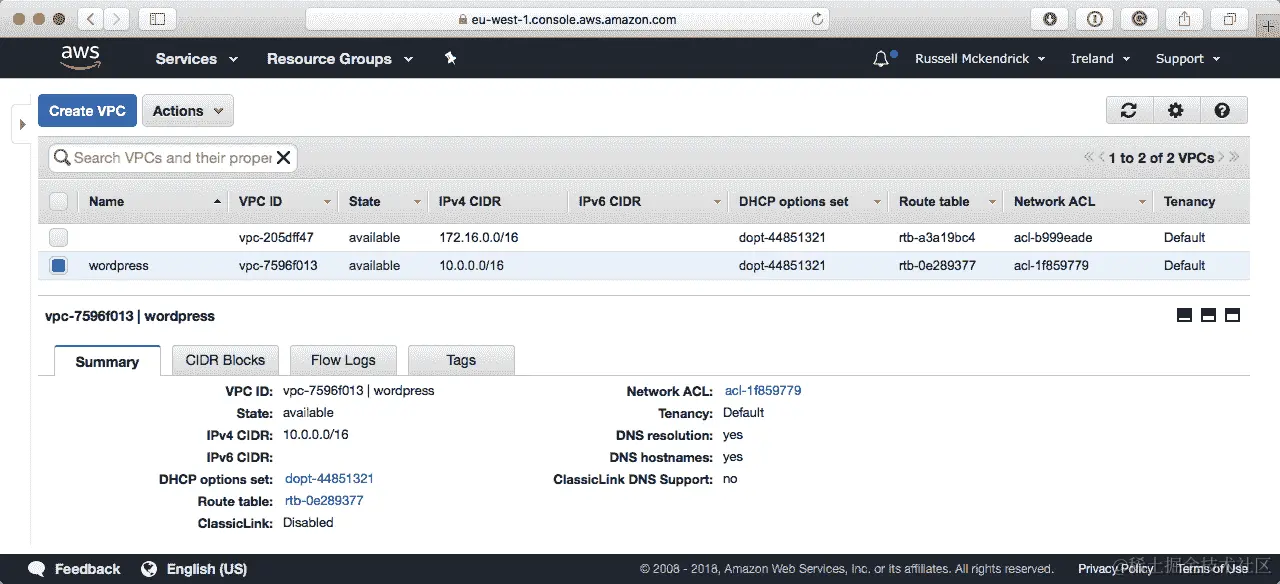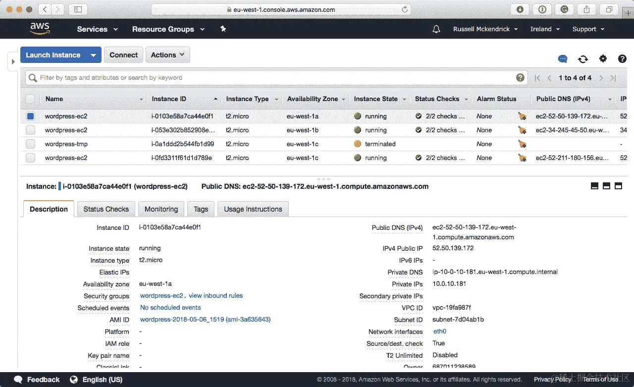 在 AWS 控制台中检查 EC2 实例,我们可以看到有三个名为wordpress-ec2的实例在运行,而wordpress-tmp实例已被终止: