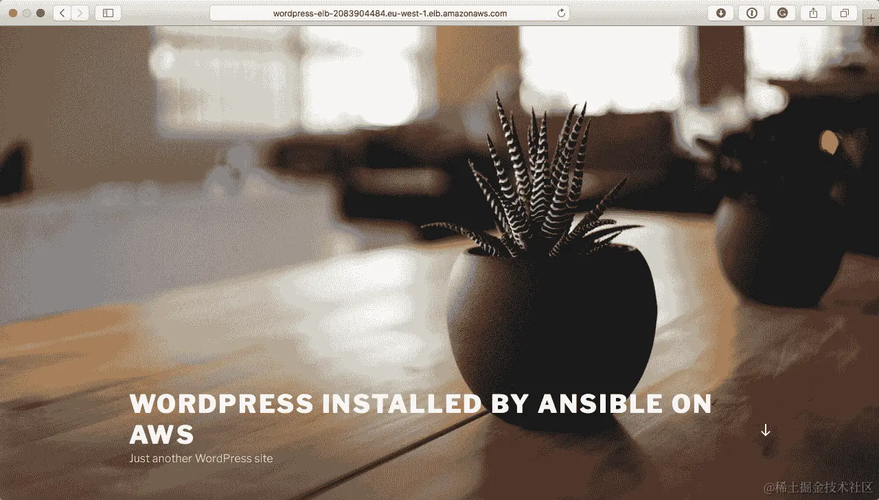 因此,通过一个命令,在 32 分钟内,我们拥有了一个高可用的普通 WordPress 安装。如果您从 AWS 控制台找到弹性负载均衡器的公共 URL,您应该能够看到您的站点: