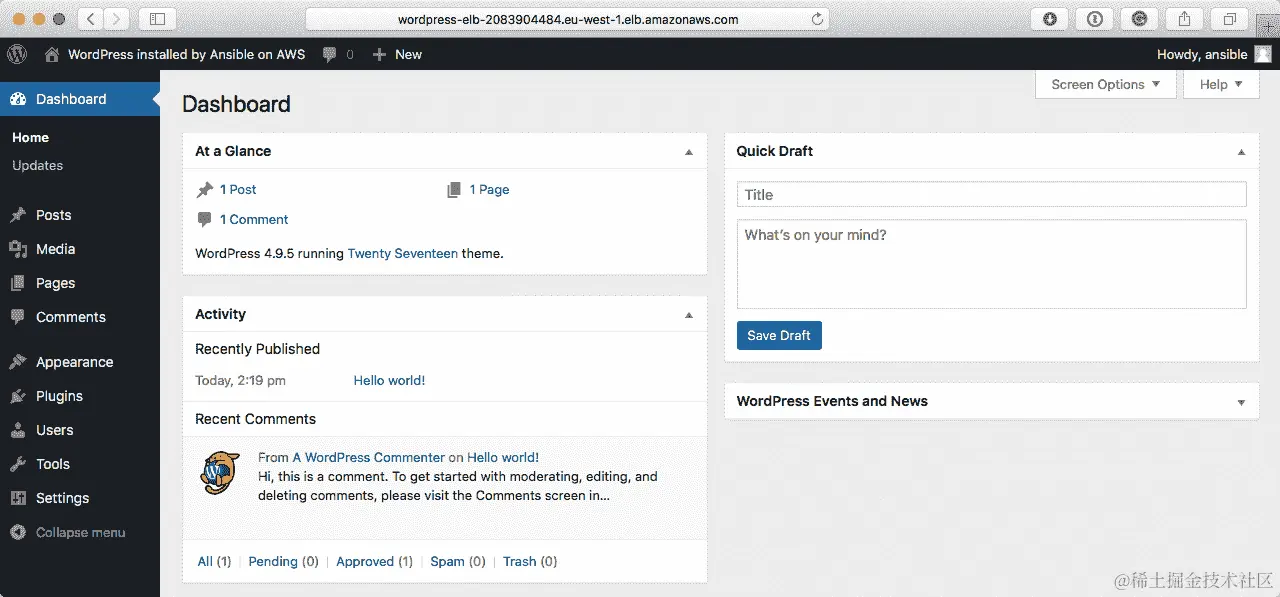完成后,我检查了一下,我仍然可以使用 playbook 中设置的用户名(ansible)和密码(password)登录 WordPress,方法是访问我的弹性负载均衡器 URL 并在末尾添加/wp-admin: