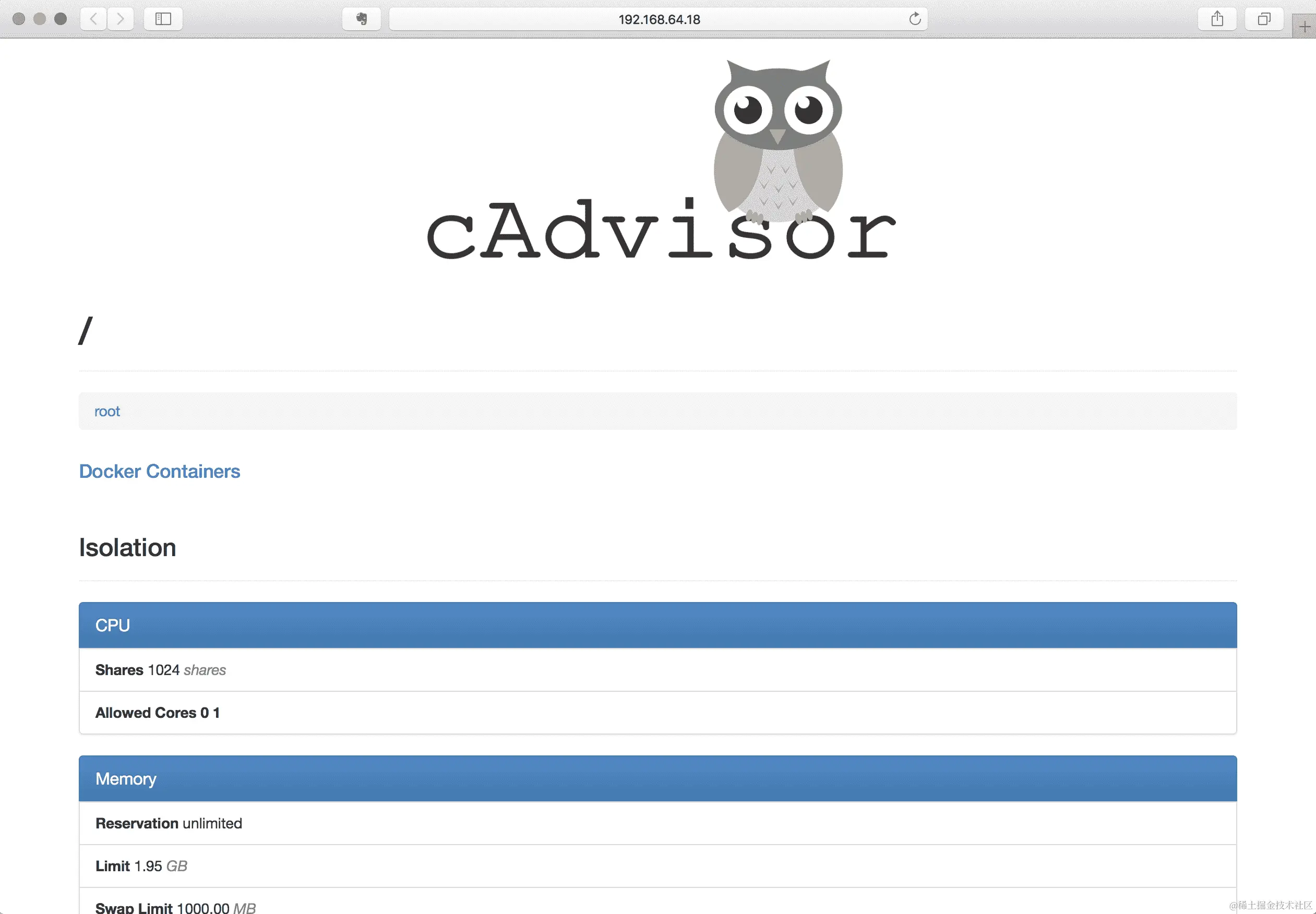 cAdvisor 提供了一个简单的基于 Web 的 UI,您可以手动查看任何节点的详细信息。如果您可以访问节点的端口4194,那么这是默认位置,可以公开 cAdvisor 的详细信息。根据您的集群设置,这可能不容易访问。在使用 Minikube 的情况下,它很容易直接可用。