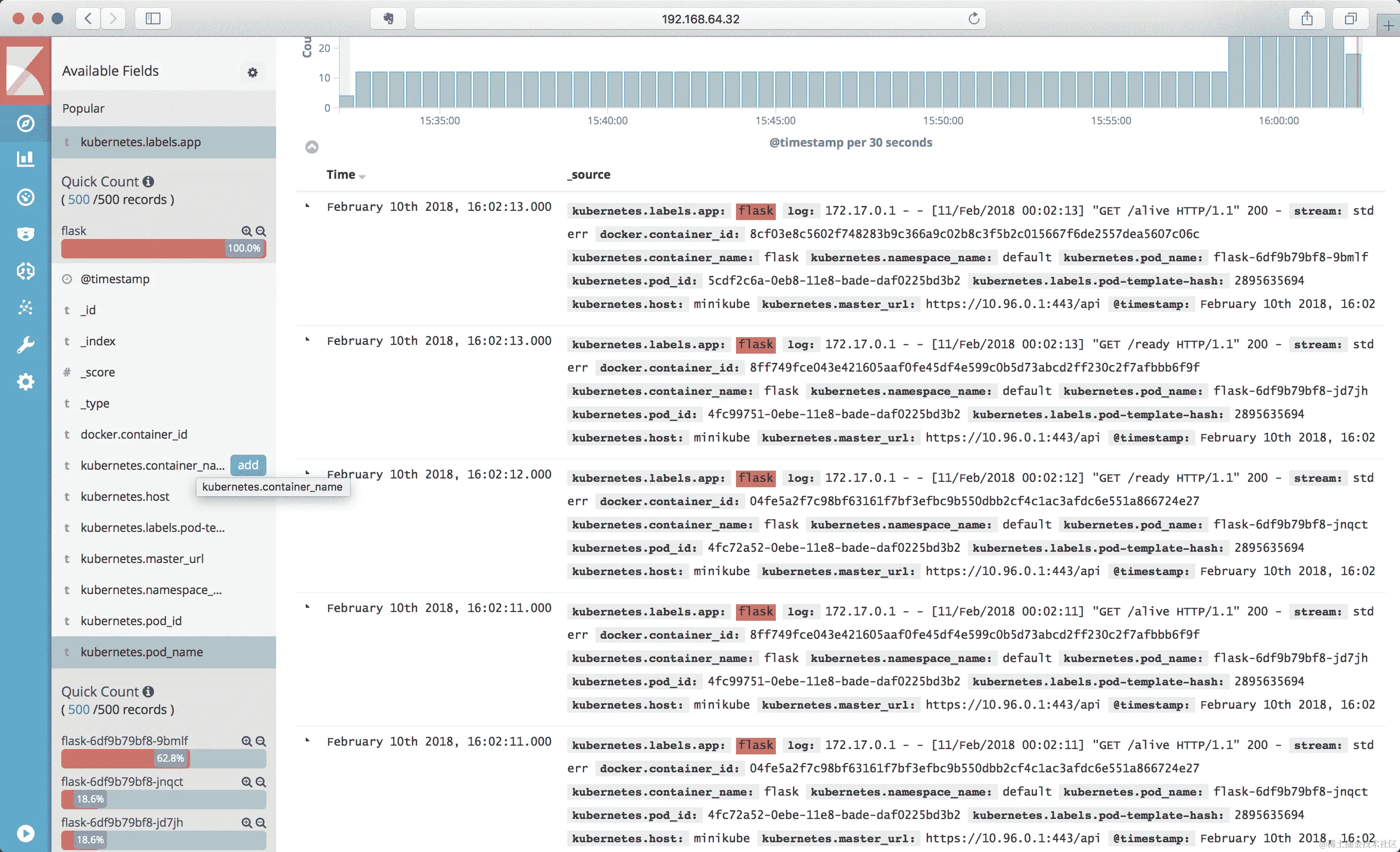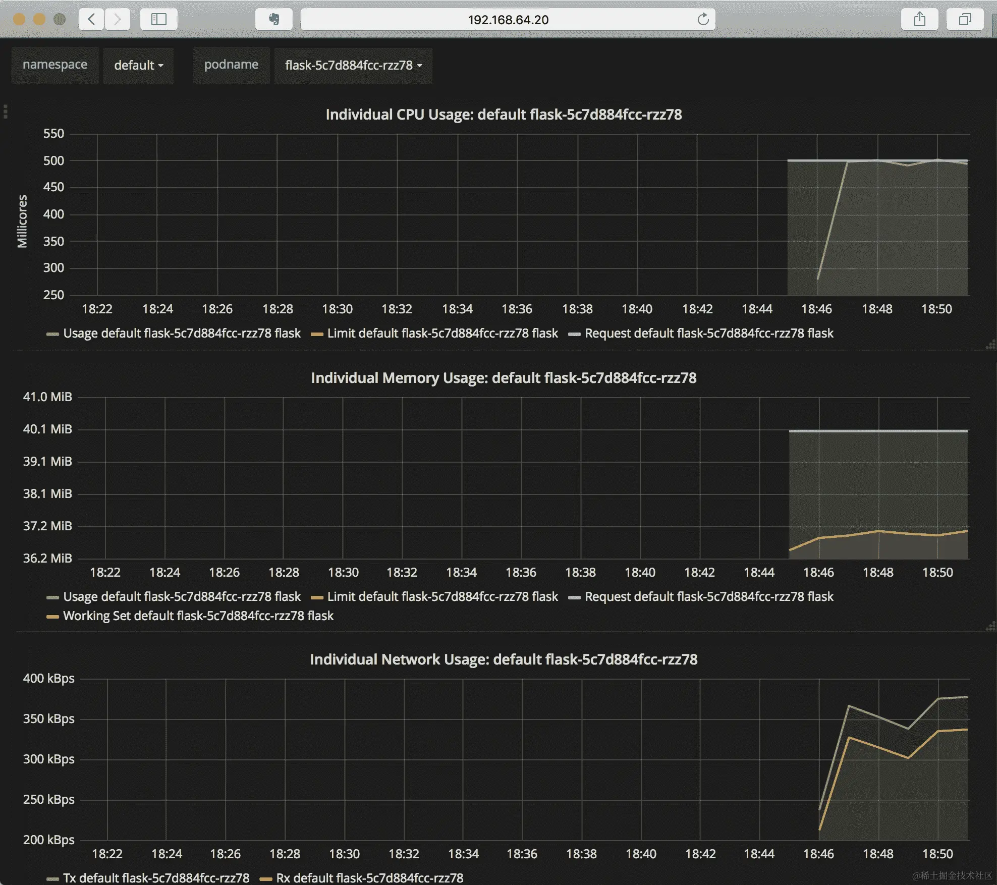 如果切换到 Pods 仪表板,您将看到该仪表板中有当前在集群中运行的所有 pod 的选择,并提供每个 pod 的详细视图。在这里显示的示例中,我选择了我们部署的flask示例应用程序的 pod: