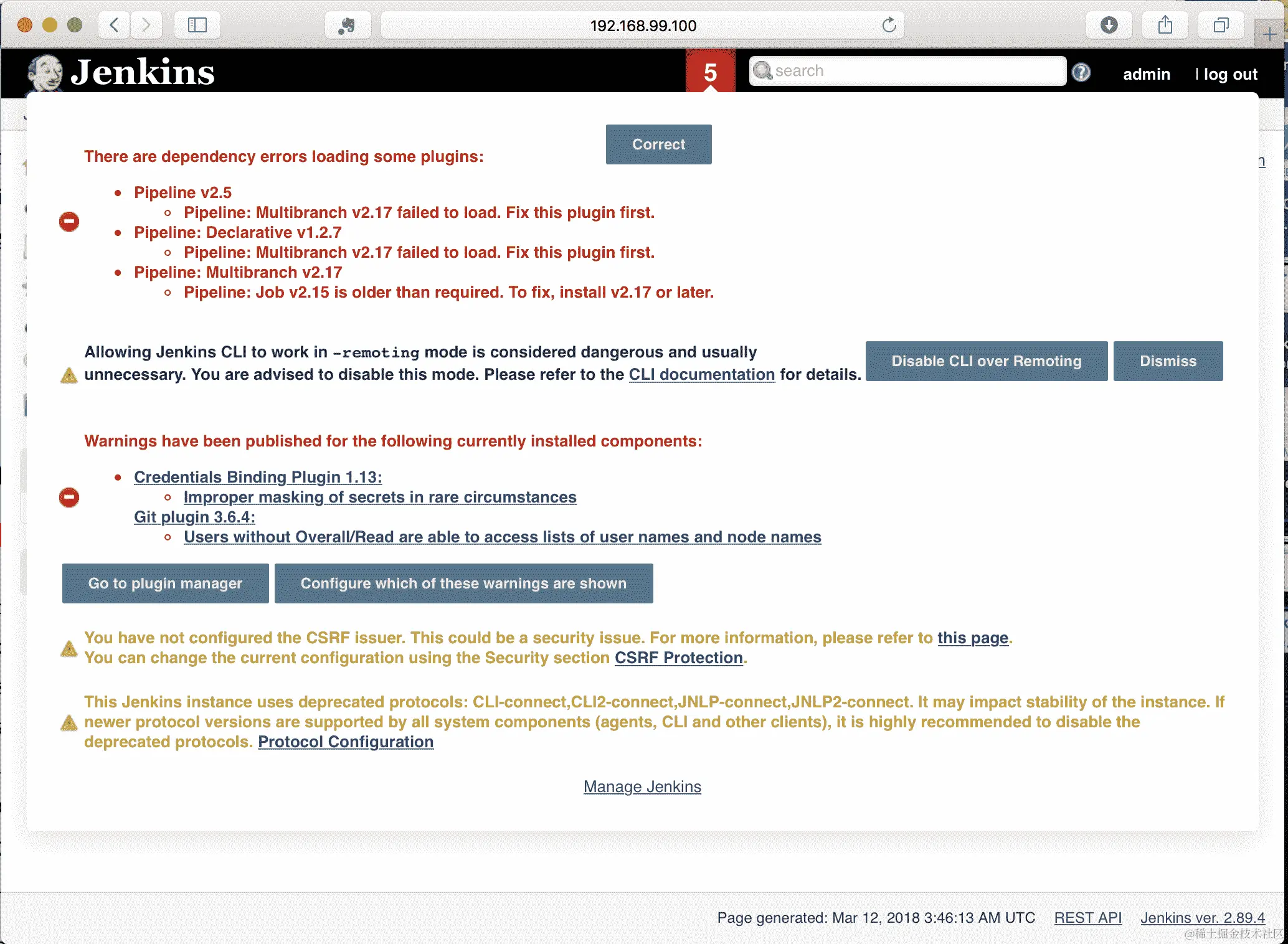 当您连接时,在前面的示例中,您可能会看到一个红色菜单项和一个数字。这是 Jenkins 提醒您应立即考虑更新的方式。我强烈建议您单击该数字并查看它所呈现的内容:
