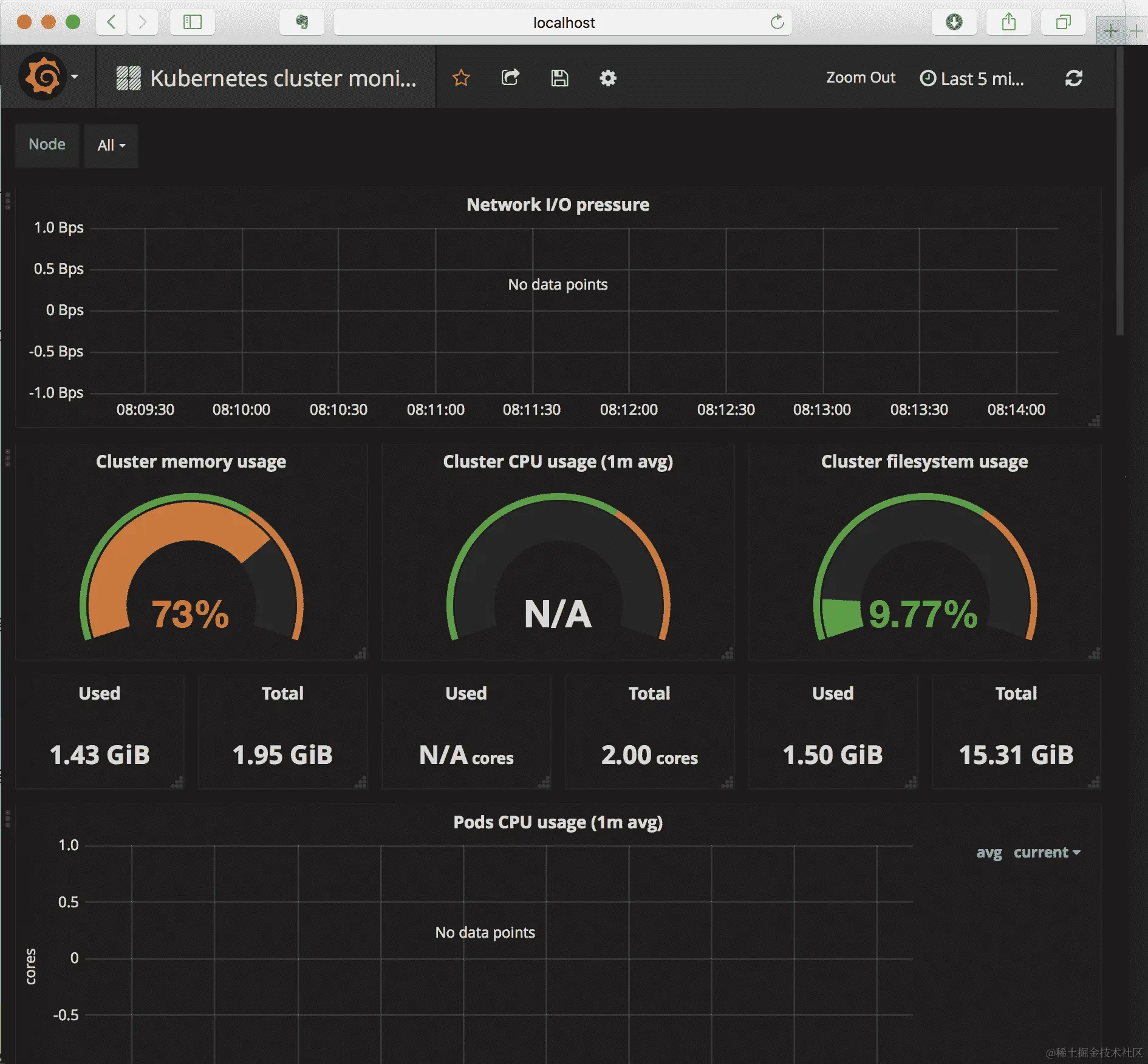 通过仪表板向下滚动,您将看到节点的 CPU、内存、文件系统和网络使用情况,以及整个集群的视图。您可能会注意到 CPU 图表有三条线被跟踪——使用情况、限制和请求——它们与实际使用的资源、请求的数量以及对 pod 和容器设置的任何限制相匹配。