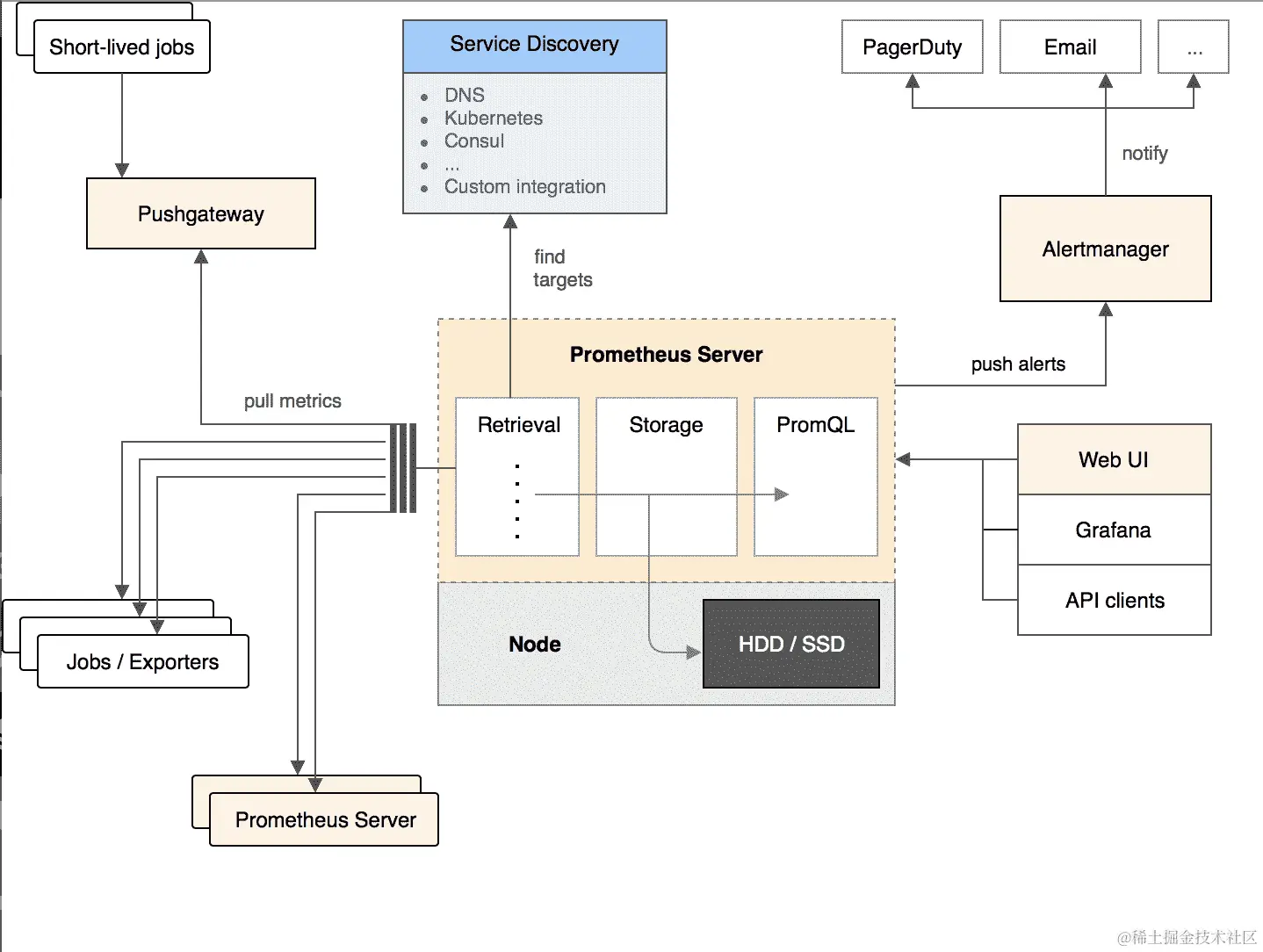 许多 Kubernetes 的安装都使用一个叫做 Heapster 的程序来从 Kubernetes 和每个节点的 cAdvisor 实例中收集指标,并将它们存储在诸如 InfluxDB 之类的时间序列数据库中。从 Kubernetes 1.9 开始,这个开源项目正在从 Heapster 进一步转向可插拔的解决方案,常见的替代方案是 Prometheus,它经常用于短期指标捕获。