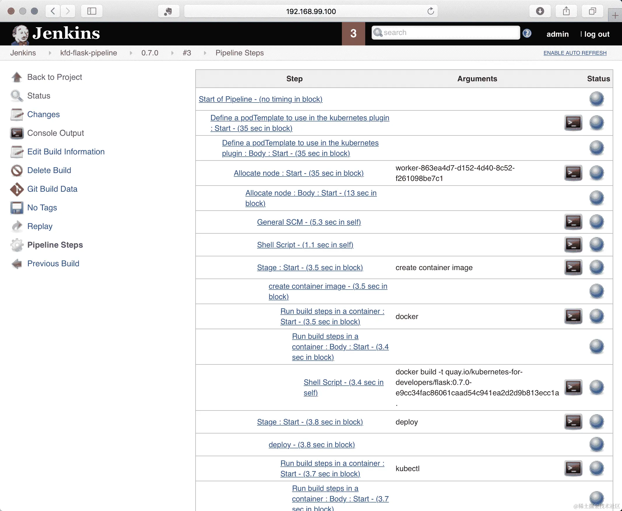 加载各种图像可能需要相当长的时间,一旦完成,结果将在 Jenkins 中可用: