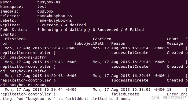 您会注意到我们正在创建此基本 pod 的四个副本。在使用create构建此 RC 后,再次在test命名空间上运行describe命令。您会注意到 pod 和 RC 的Used值已达到最大值。然而,我们要求四个副本,但只看到三个正在使用的 pod。