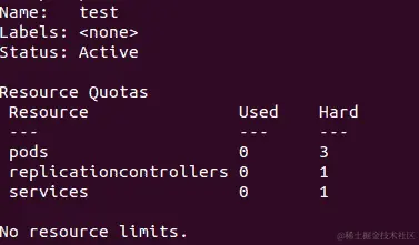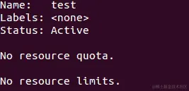 Kubernetes 允许您限制单个 pod 或容器使用的资源以及整个命名空间使用的资源。请注意,test命名空间目前没有设置资源限制或配额。