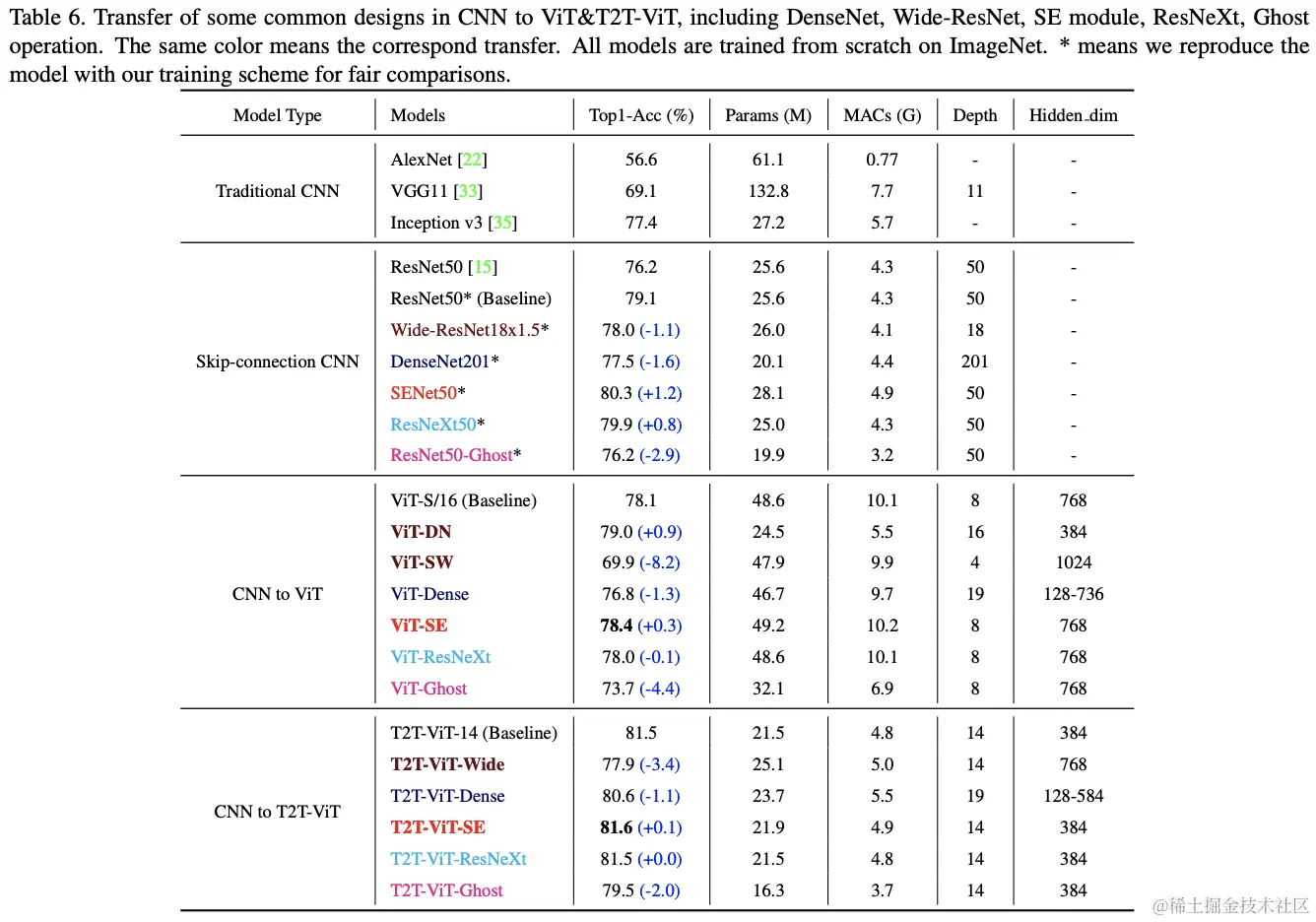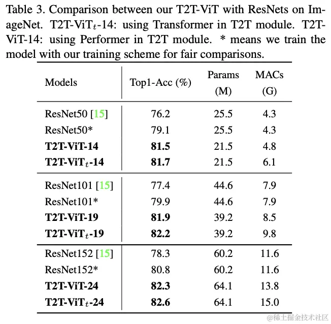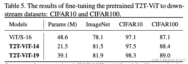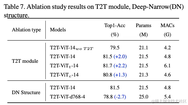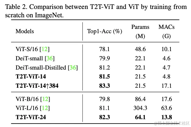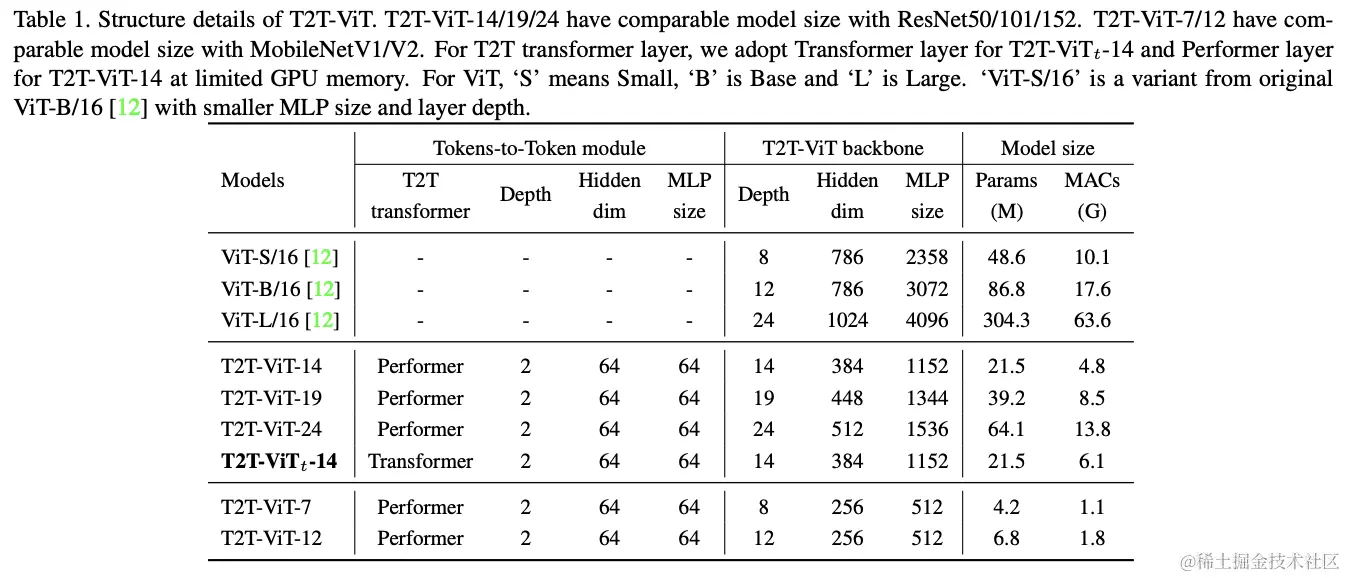 此外,由于T2T模块中的token长度大于ViT中的一般设置(16 × 16),MAC和内存使用量都很大。为了解决这个问题,将T2T层的通道维度设置为较小的值(32或64)来减少 MAC,也可以采用高效的Transformer层变种,例如 Performer层,从而在有限的GPU内存下减少内存使用。