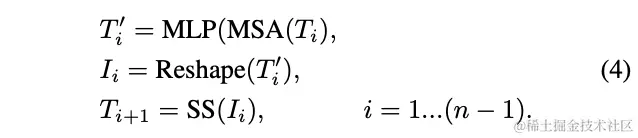 其中MSA为具有层归一化的多头自注意操作,MLP是标准Transformer中具有层归一化的多层感知器。MSA输出的将被重塑为空间维度上的图像: