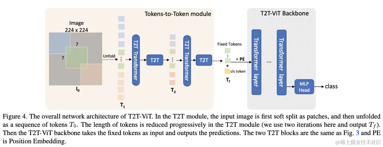 T2T-ViT包含两部分:Tokens-to-Token(T2T)模块和T2T-ViT主干网络。T2T模块有多种设计选择,论文设置,T2T模块中有次Soft Split和次Re-structurization。三次Soft Split的分区区域设置为,重叠区域设置为,可以将的输入图片压缩为的token序列。