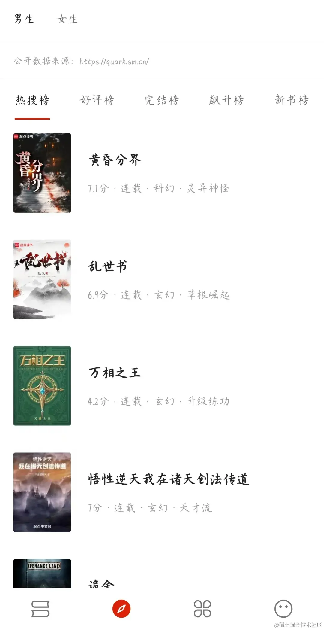如果你暂时不知道阅读什么书籍,可以从软件下方导航栏的【发现】入口,看最新的热门书籍榜单,该数据是由公开的【夸克浏览器】热门书籍推荐