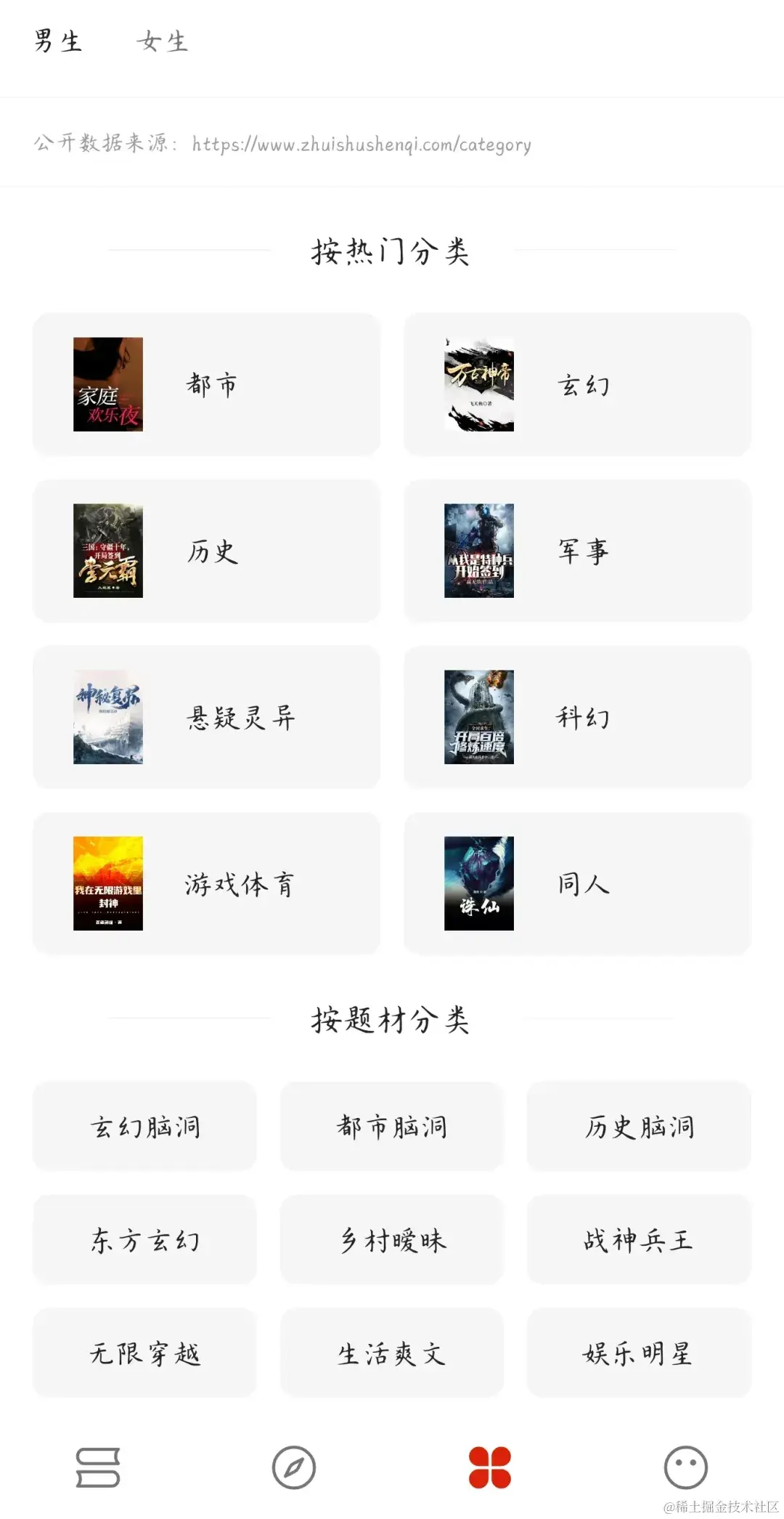 当然,你也可以选择从不同分类的书籍中查看阅读,该分类来源于公开的【追书神器】分类细则