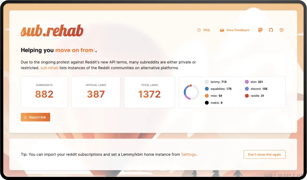 因为之前 Reddit 新的 API 条款引发了持续抗议,很多子版块要么变成了私密状态,要么被限制访问。sub.rehab 这个网站记录了 Reddit 社区的一些子版块在其他平台上的情况,有空也可以在这里找到一些有趣的板块。