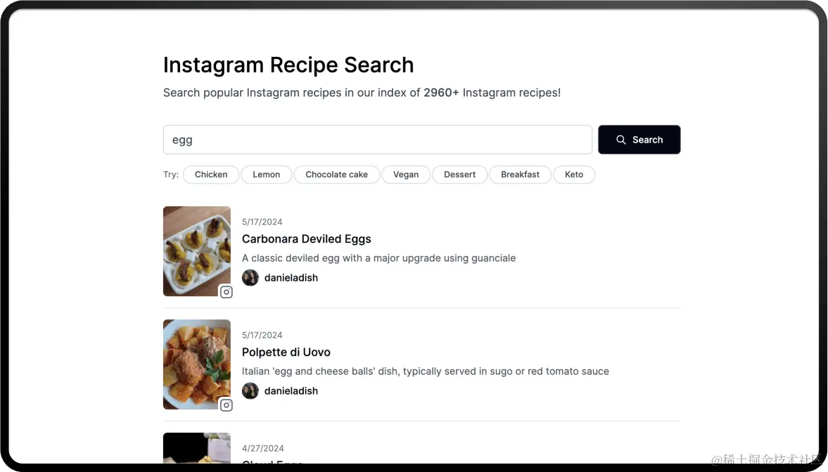 作者创建了一个 Instagram 的食谱搜索引擎,还是挺有趣的。已经收录了 2960+ Instagram 菜谱。
