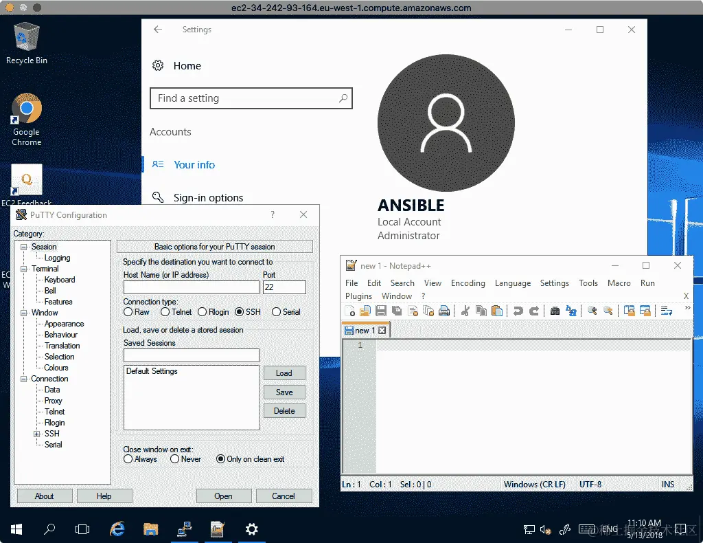 从输出中可以看出,我的 EC2 实例的主机名是ec2-34-245-2-119.eu-west-1.compute.amazonaws.com,ansible用户的密码是Qb9LVPkUeZFRx5HLFgVllFrkqK7HHN。我可以使用这些详细信息连接到实例,使用 Microsoft RDP(记住它被锁定到您的 IP 地址)。如下截图所示,我以 Ansible 用户身份连接,并打开了 PuTTY 和 Notepad ++;您还可以看到桌面上的 Google Chrome 的快捷方式:
