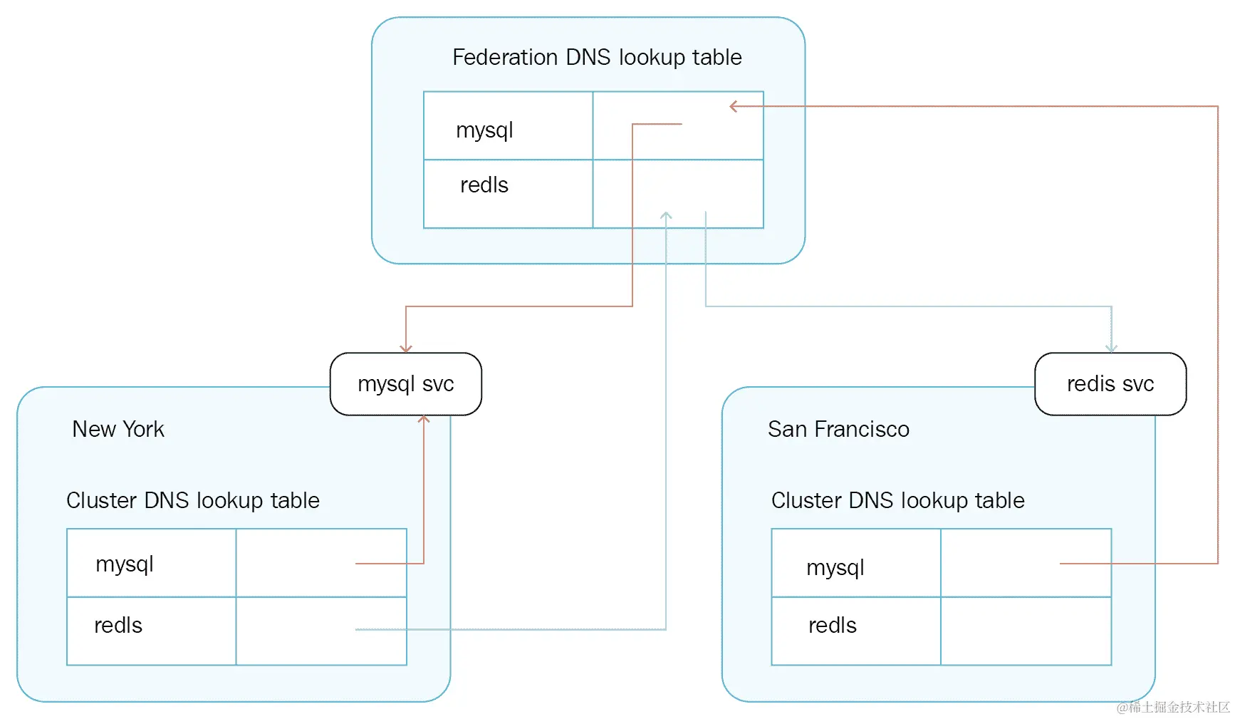 (按命名空间)DNS 名称约定。例如,the-service解析为默认namespace中的the-service服务,而the-service.the-namespace解析为the-namespace namespace中名为the-service的服务,该服务与默认的the-service不同。Pod 可以使用 KubeDNS 轻松找到和访问内部服务。Kubernetes 集群联邦将该机制扩展到多个集群。基本概念是相同的,但增加了另一级联邦。现在服务的 DNS 名称由<service name>.<namespace name>.<federation name>组成。这样,仍然可以使用原始的<service name>.<namepace name>命名约定来访问内部服务。但是,想要访问联邦服务的客户端使用联邦名称,最终将被转发到联邦成员集群中的一个来处理请求。