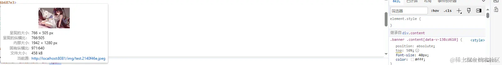 请注意: 若使用网络图片,则没有影响;若使用的是本地图片,这里的图片不能使用相对路径,需要使用源路径。可先将所需图片放置在页面中,如下图所示,可以在浏览器中,通过点击键盘上的F12,可以通过筛选器找到图片所在的元素后,鼠标悬浮在该元素,即可查看源图片路径。