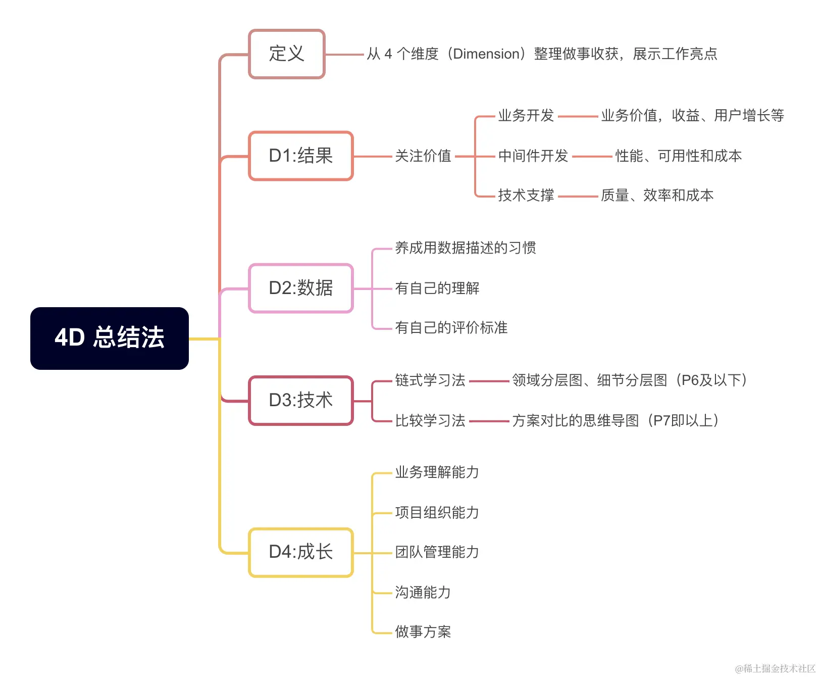 那么,如果做总结呢?就需要使用 4D 模型,从结果、数据、技术、成长四个方面总结项目。