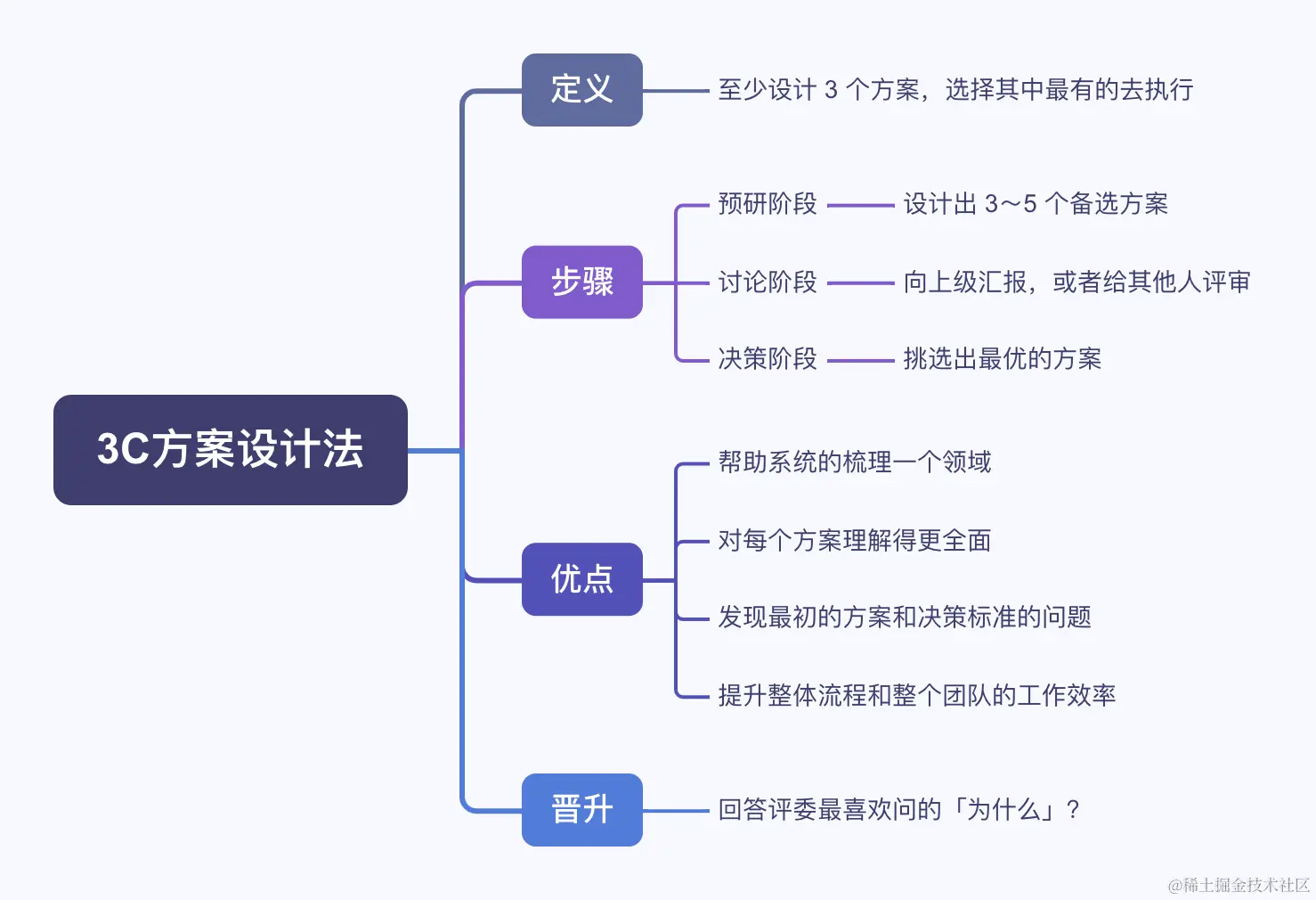 方案选择使用 3C 模型:每次设计 3 个左右的备选方案,方案评选的时候,选择最优的方案。