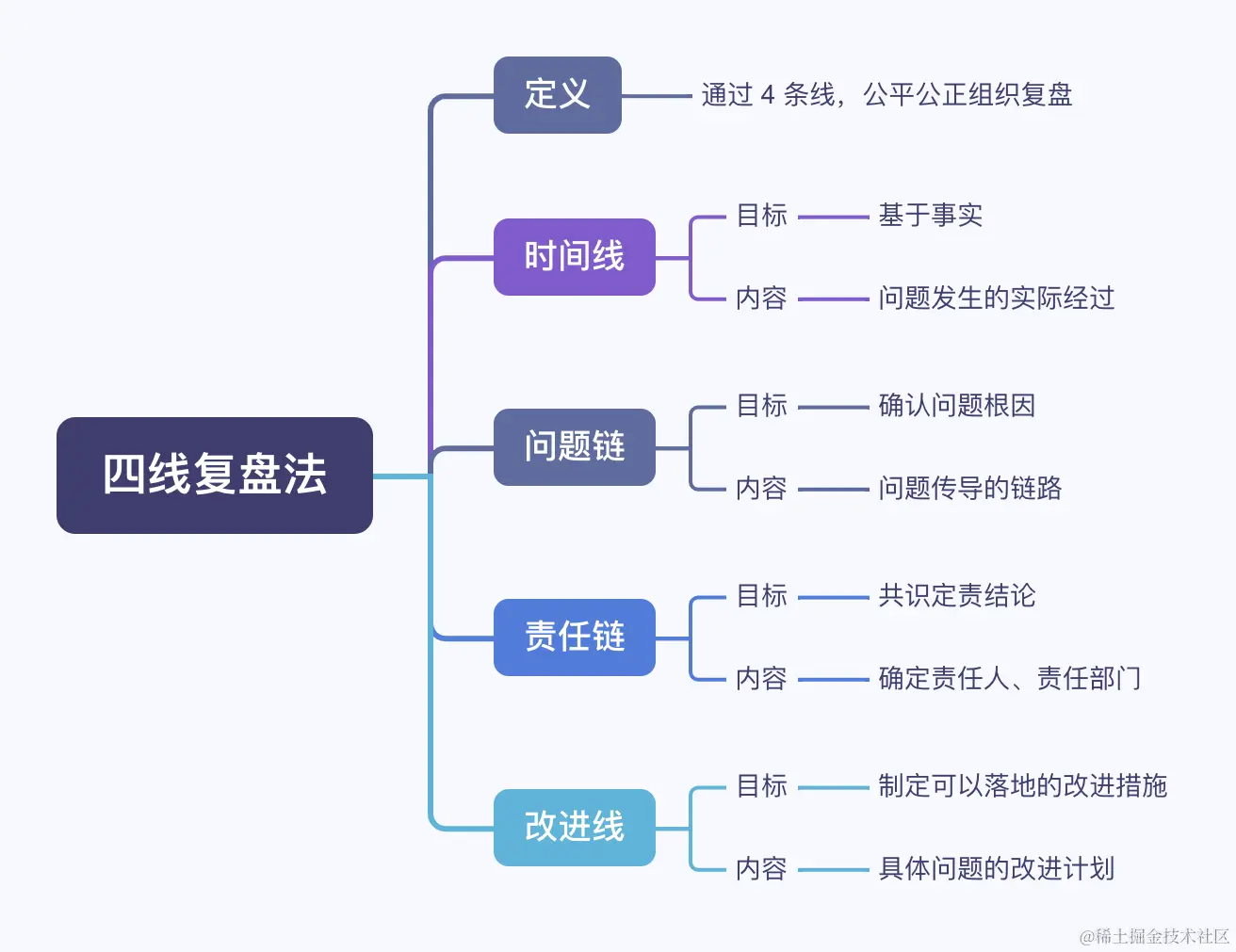 使用四线复盘法,能够让我们对问题复盘有自己的判断,基于时间、事实、问题根因、责任链、改进线进行问题复盘,能够让我们得到一个大家都认可的复盘结果。