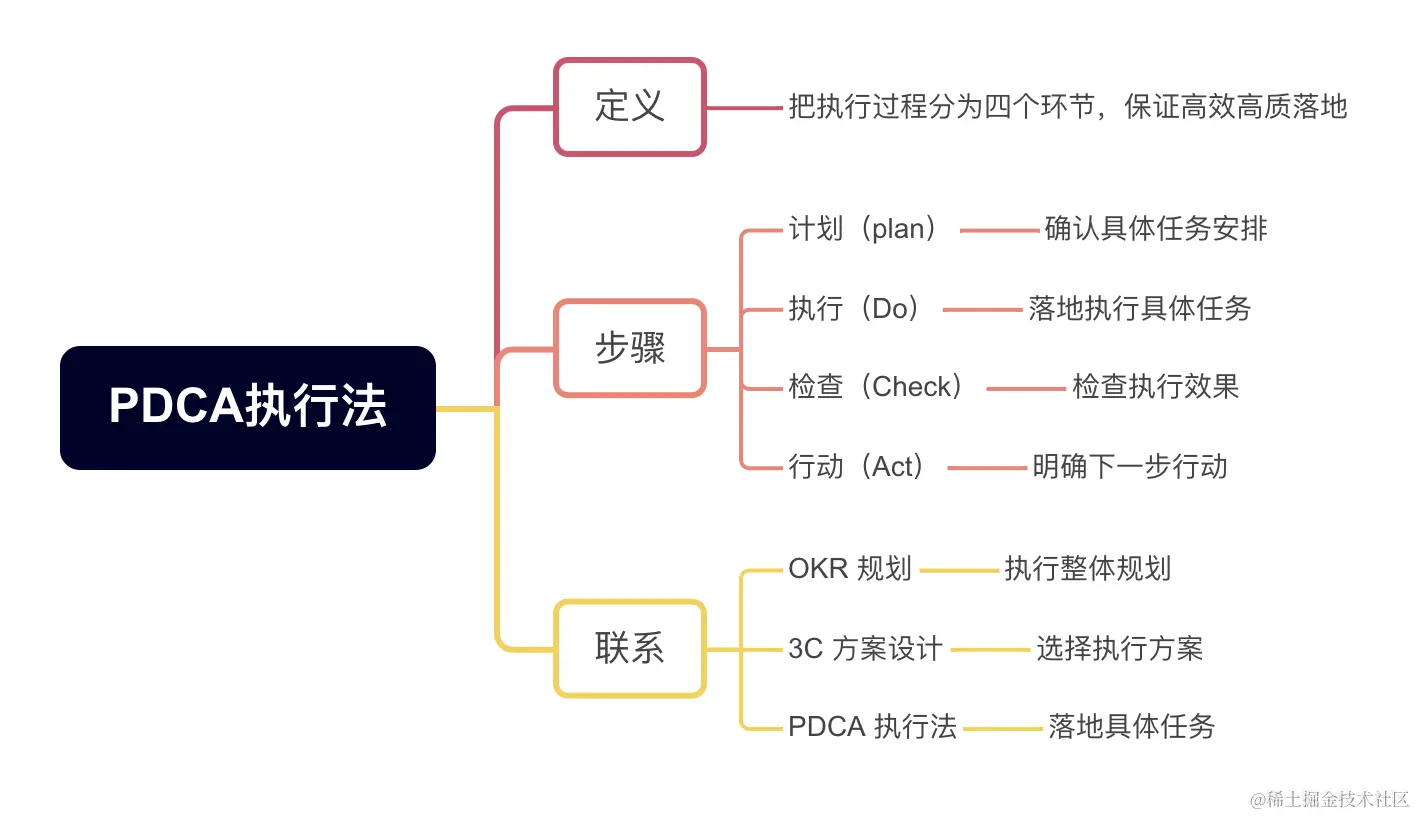 使用 PDCA 执行法,把事情的执行过程进行拆分,从而把控执行过程。这个方法适合 Team Leader、虚拟团队负责人、项目负责人、领域负责人等角色。