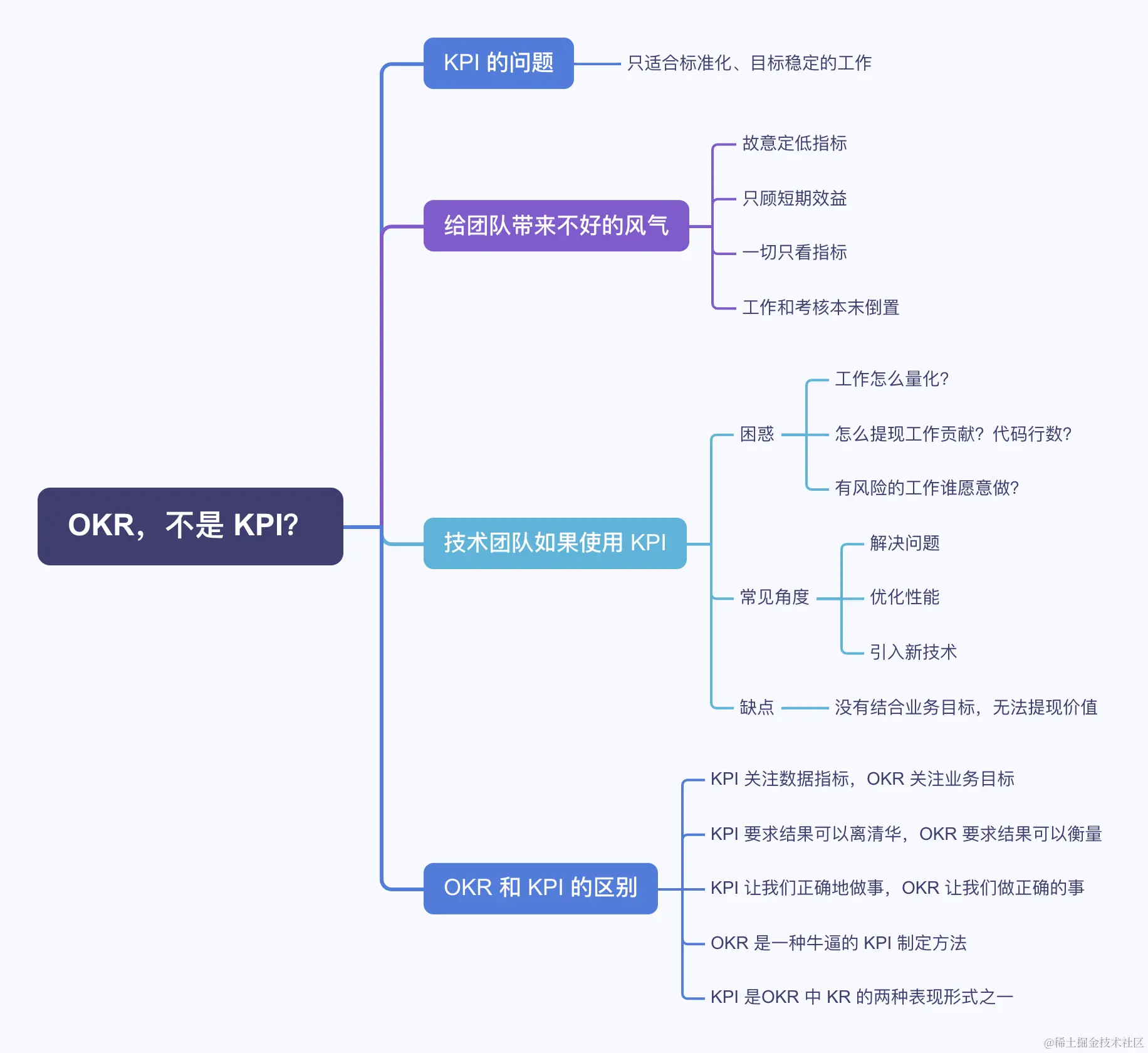 OKR 更关注业务目标,不一定可量化,但是可衡量。它是一个比 KPI 更高一个维度的规划方法。