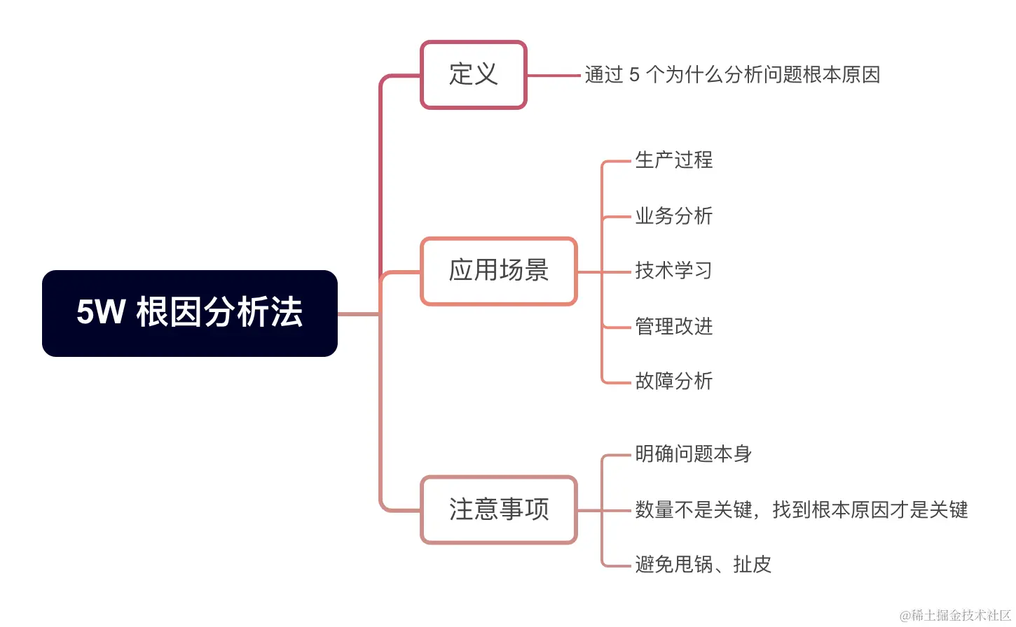 对于具体的一个问题,我们不需要十万个为什么?但是 5 个左右的为什么(why)是我们找到问题根因的基本保证,它让我们避免浮于表面,错过根本原因。