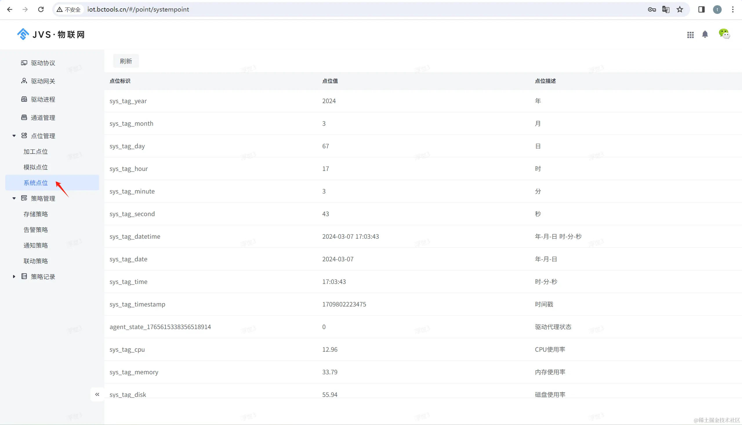 随着信息技术的飞速发展,现代系统对于信息的获取、处理和展示有了更高的要求。在JVS物联网平台中引入了系统点位功能。系统点位为用户提供了直观、实时的系统状态信息,如设备连接状态、驱动实例状态、驱动代理状态等,还涵盖了时间信息、系统资源使用情况等重要数据。