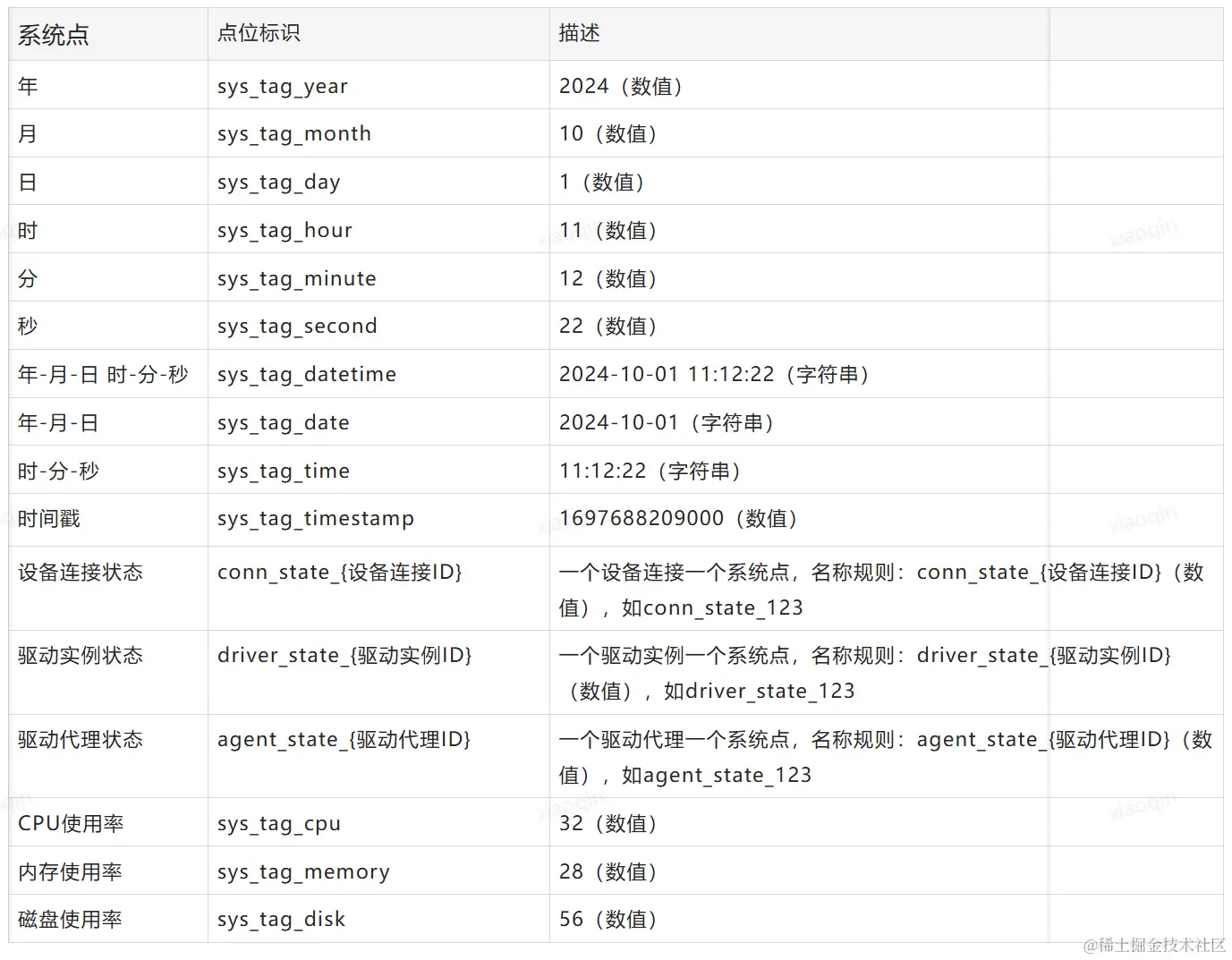 为了用户能够使用系统相关的信息,需要引入系统点的概念,比如设备连接的状态、驱动实例的状态、驱动代理的状态、当前时间等等。系统点位由系统提供,提供界面展示和选择。