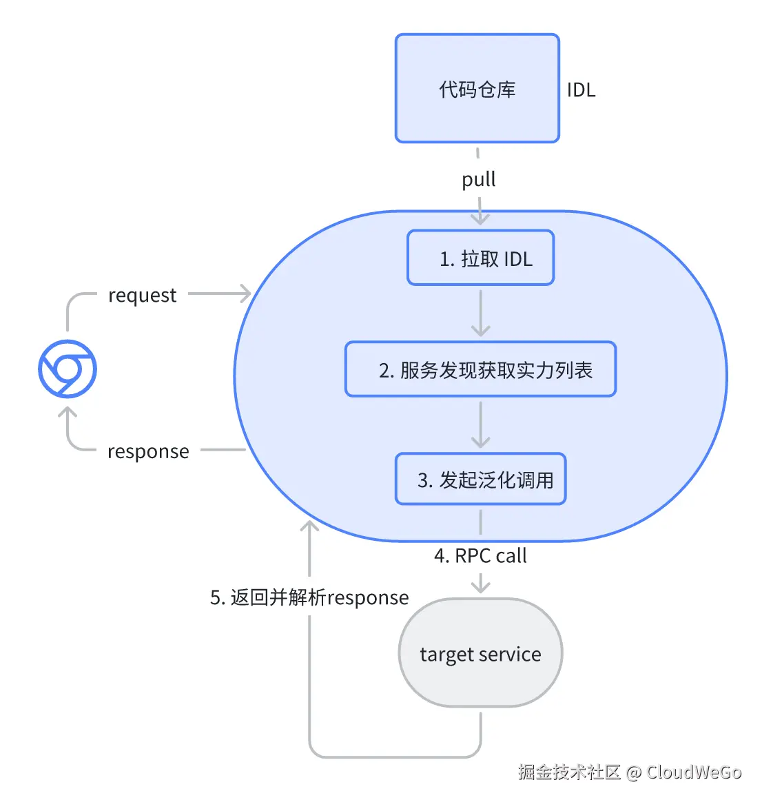 基于 Kitex PB 的 JSON 映射泛化调用实现。用户在平台上选择对应服务和接口,平台自动解析对应的 IDL 文件,给出默认的请求参数(json 格式)。发送请求后,平台通过泛化调用的方式向目标服务发起一次 RPC 请求,并将结果返回。
