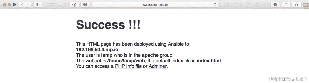 虽然这表明 PHP 已安装并运行,但并不是很有趣,因此在运行 playbook 之前,让我们添加一些将我们的 LAMP 堆栈所有元素联系在一起的步骤。