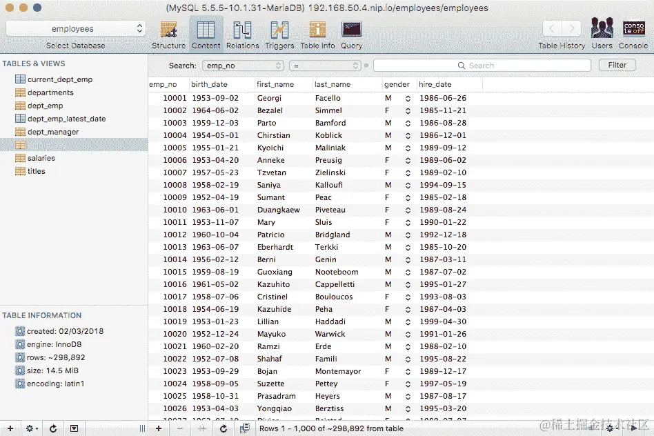 在第二个链接中,一旦使用用户名root和密码Pa55W0rd123登录,您应该能够看到employees数据库: