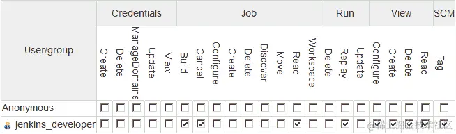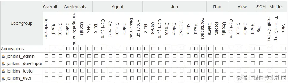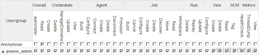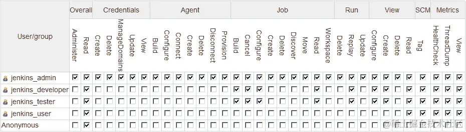 jenkins_admin完全访问权限。用户jenkins_developer和jenkins_tester已被授予读取和执行 Jenkins 作业的访问权限,而用户jenkins_user仅被授予读取权限: