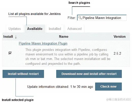 选择完插件后,点击页面底部的安装按钮。以下截图显示了 Jenkins 插件安装: