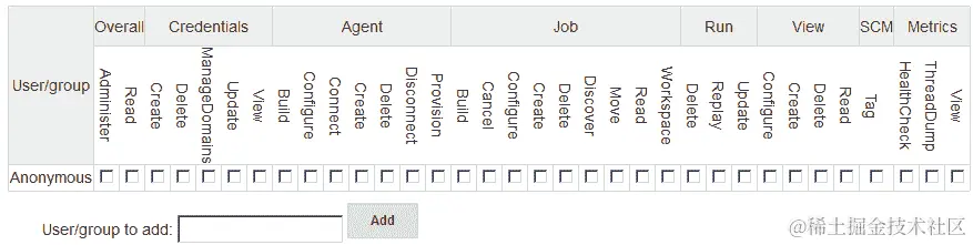从前面的屏幕截图中,您可以看到列代表 Jenkins 中的各种项目,而行代表各种用户。在矩阵底部有一个选项可添加用户。