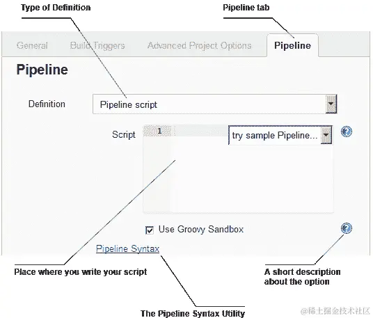 Definition字段提供两个选择——管道脚本和来自 SCM 的管道脚本。如果选择管道脚本选项,那么在脚本字段内定义你的管道代码。但是,如果选择来自 SCM 的管道脚本选项(截图中未显示),那么你的管道脚本(Jenkinsfile)将自动从版本控制系统中提取(我们将在接下来的部分中探讨这个选项)。 -