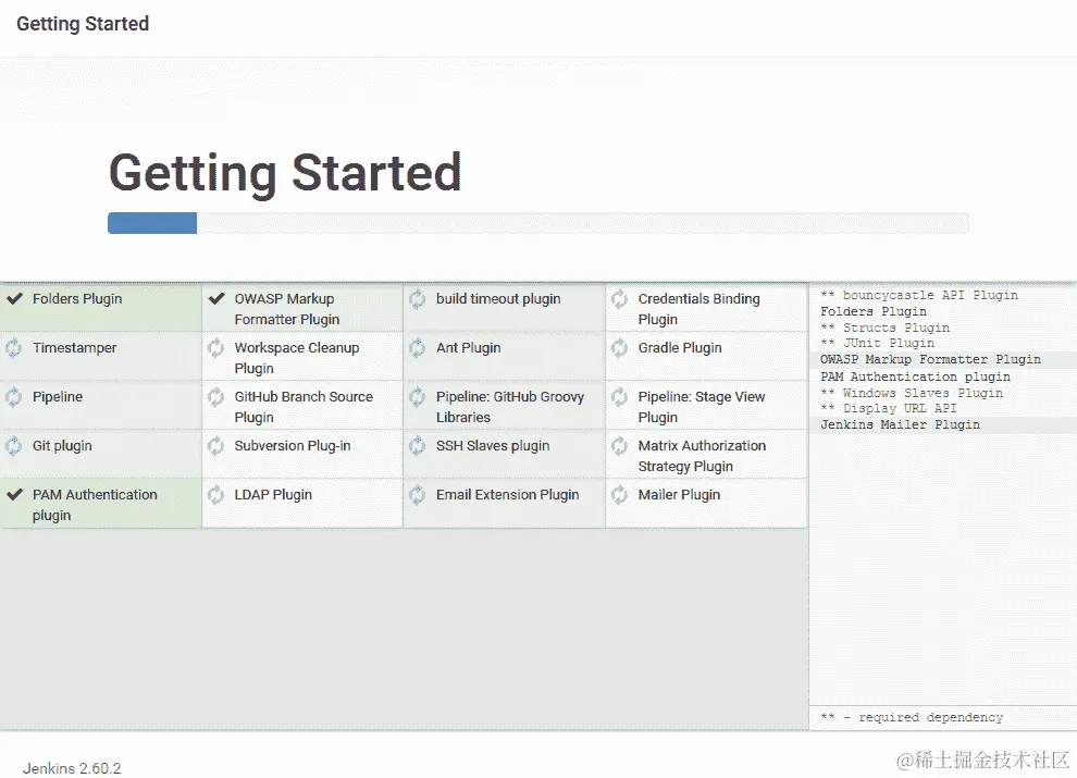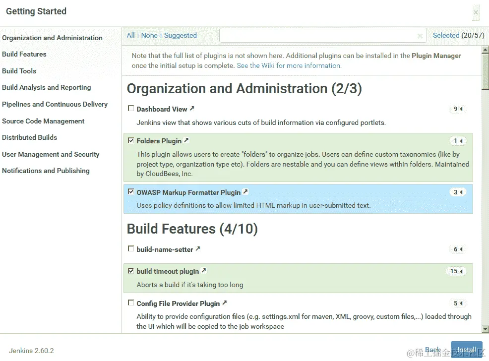 确保您的 Jenkins 服务器已安装所有建议的插件。请参阅 Customizing Jenkins 部分。