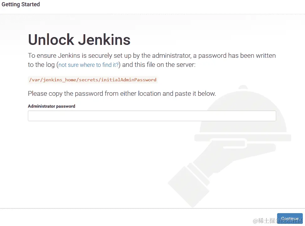 从 initialAdminPassword 文件中获取密码,粘贴到管理员密码字段下,然后点击继续。